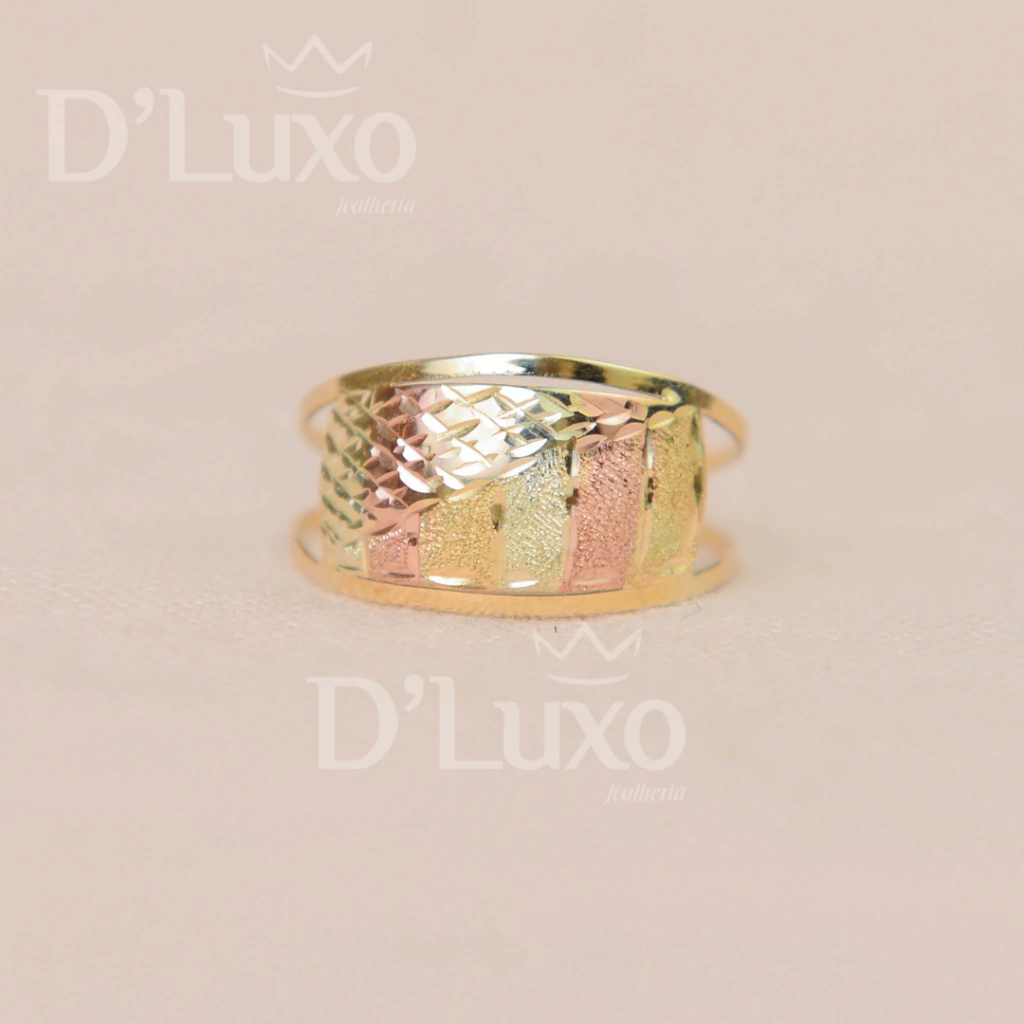 Descubra a sofisticação do Anel de Chapinha Trabalhada, uma peça que exala elegância e encanto. Disponível em tamanho médio, este anel é confeccionado em ouro 10k (416k) ou ouro 18k (750k), com um deslumbrante acabamento em três tons de ouro, que realça sua beleza e exclusividade.