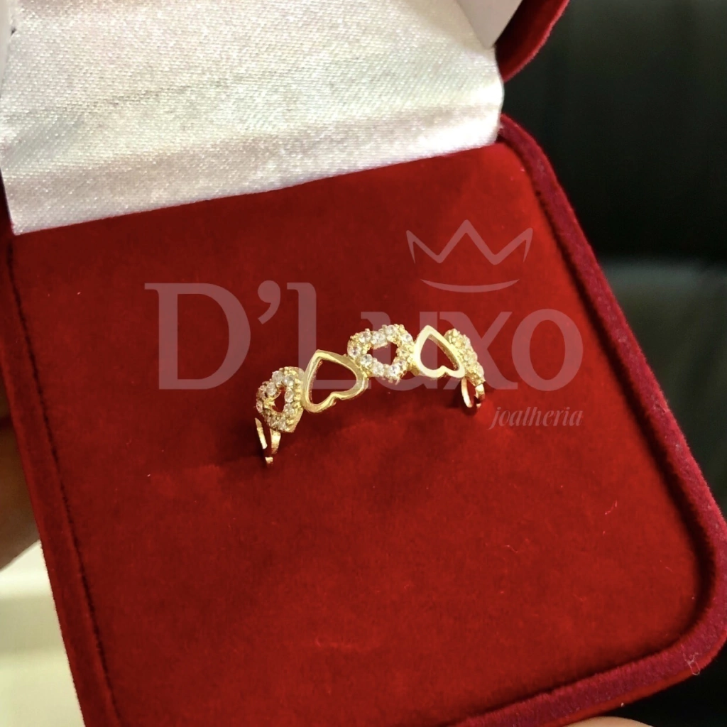Anel de corações até a metade, cravejado com pedras de zirconia.