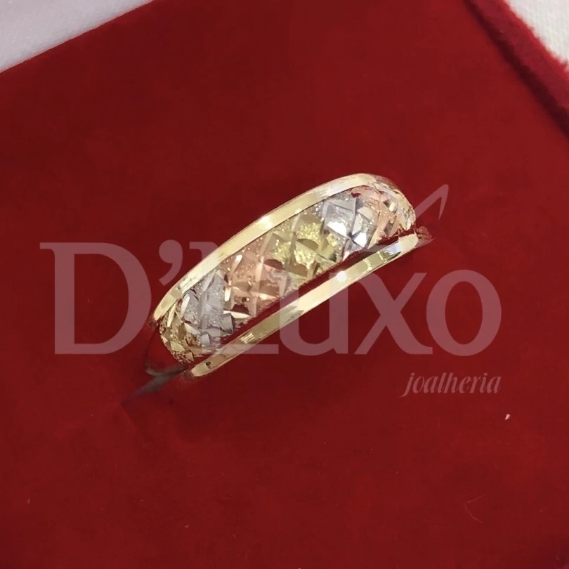 Feito em ouro 416k, o anel apresenta um design sofisticado que destaca os três tons de ouro: amarelo, branco e rosa. Cada detalhe foi minuciosamente elaborado para oferecer um visual deslumbrante, ideal para qualquer ocasião, seja uma festa, um encontro romântico ou para o uso diário.