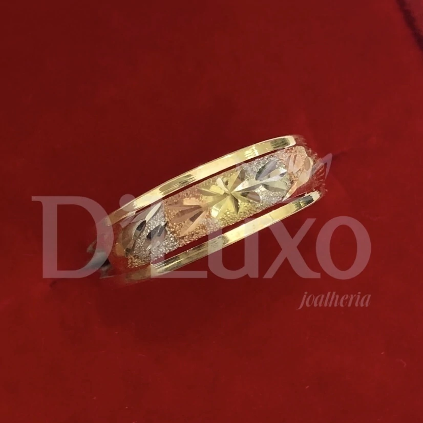 Feito em ouro 416k e ouro 18k, o anel apresenta um design sofisticado que destaca os três tons de ouro: amarelo, branco e rosa. Cada detalhe foi minuciosamente elaborado para oferecer um visual deslumbrante, ideal para qualquer ocasião, seja uma festa, um encontro romântico ou para o uso diário.