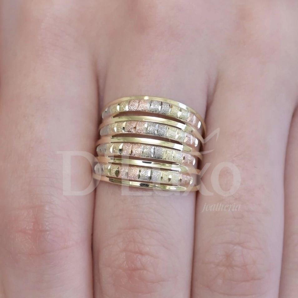 Descubra a elegância do Anel Lush da coleção D’Imperial, uma joia que transcende o tempo e realça a beleza de quem a usa. Este anel 4 elos é confeccionado em três tons de ouro, apresentando um trabalhado diamantado feito à mão, que proporciona um brilho único e sofisticado.