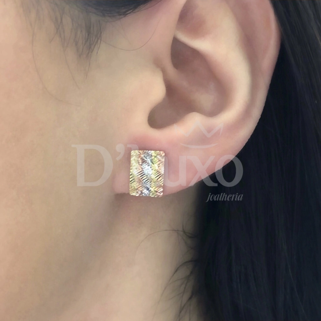 Brinco de chapinha trabalhado em 3 tons de ouro.