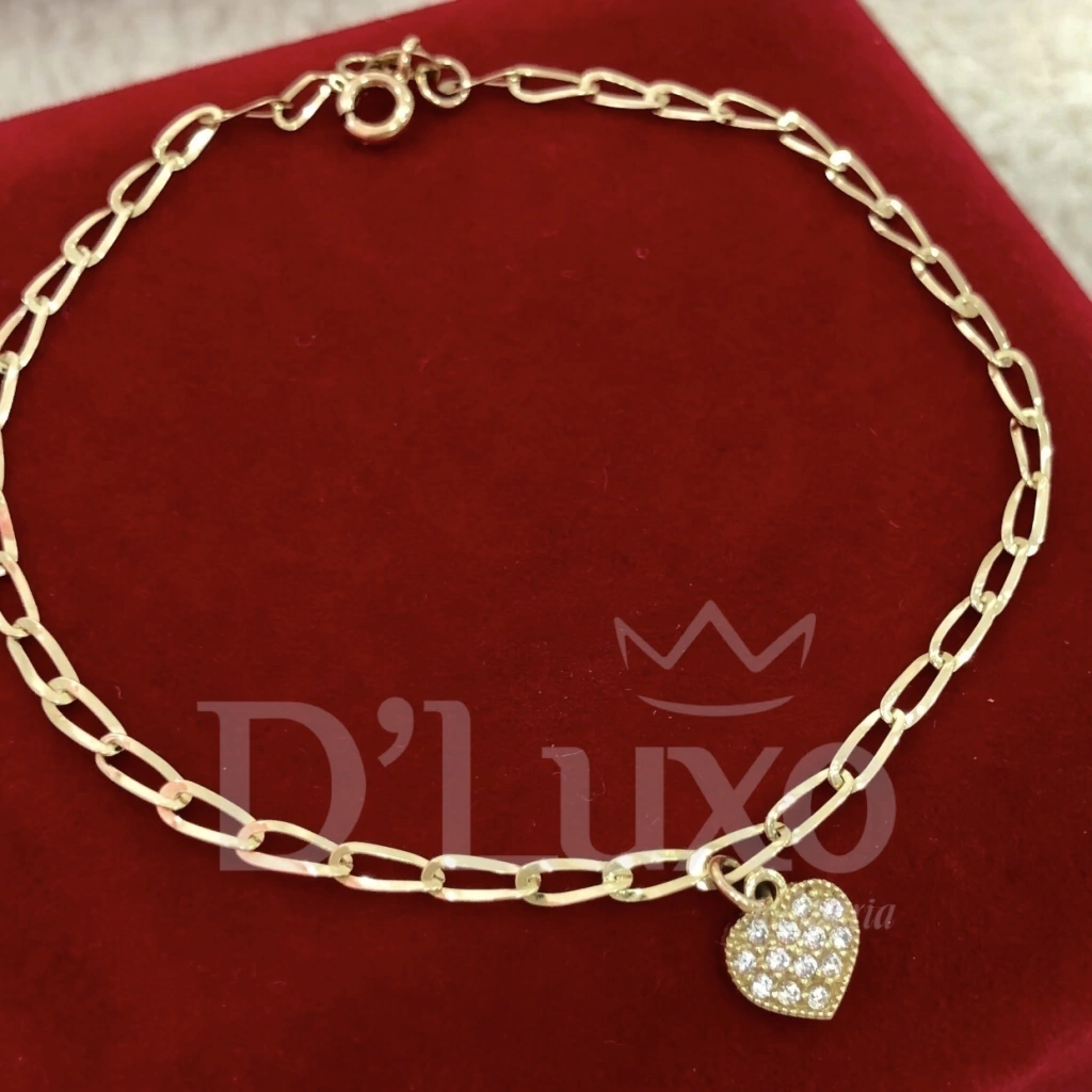 Pulseira de elo laminado pingente de coração cravejado com zirconias.